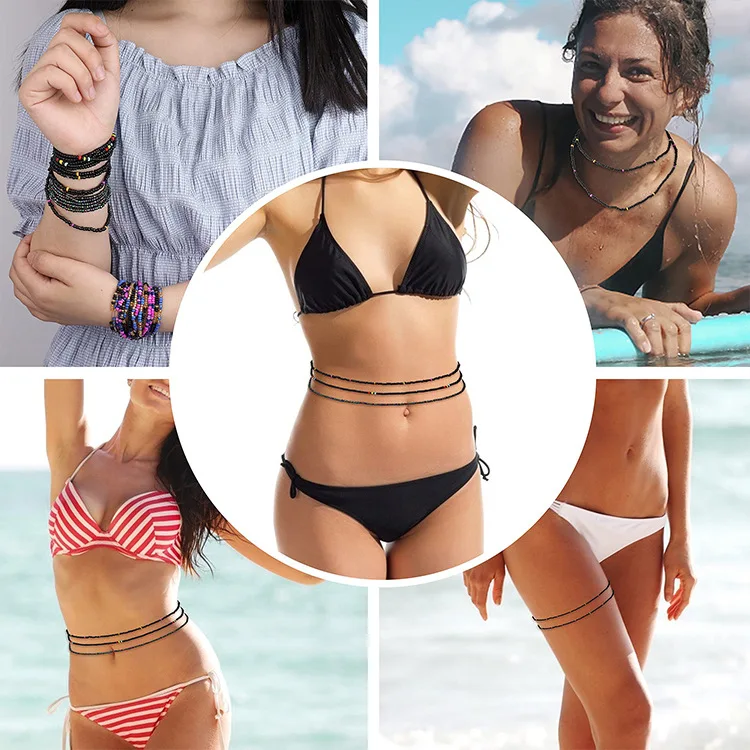 Add a touch of bohemian style to your summer wardrobe with our 3-piece jewelry set! These colorful elastic rice bead anklets and waist chains will add a unique and vibrant touch to any beach or bikini look. With their comfortable fit and eye-catching design, you'll be sure to stand out and make a statement.