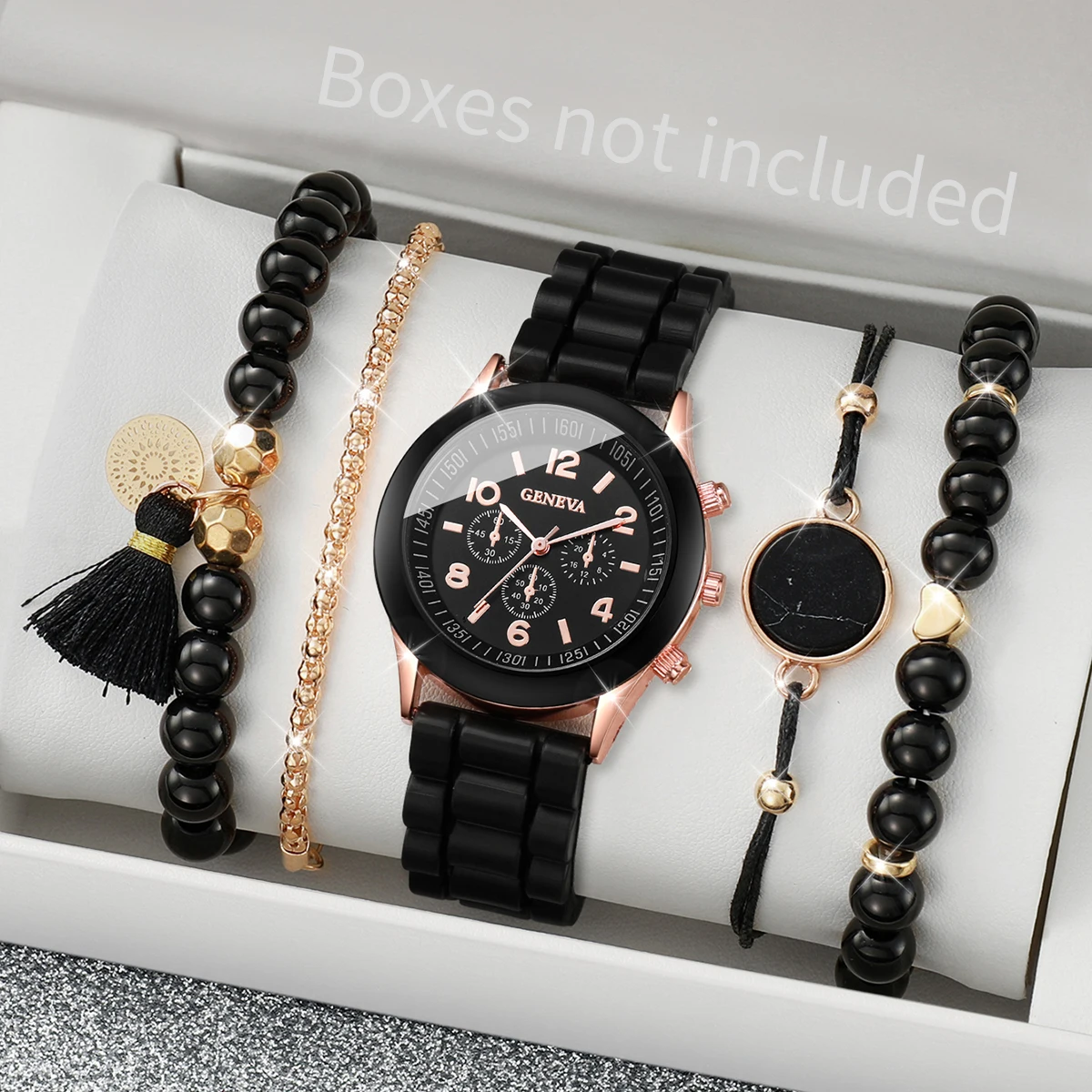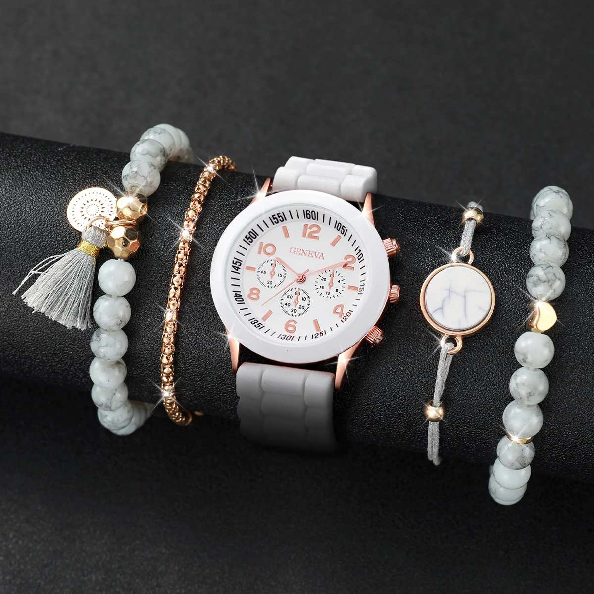 Upgrade your style with this gorgeously crafted 5PCS/Set Geneva Watch Fashion Women's Silicone Band Quartz Watch Turquoise Beaded Bracelet Set! The trendy silicone band combined with a beautiful beaded design adds a touch of luxury to your everyday look. Stay punctual and fashionable with this must-have set.