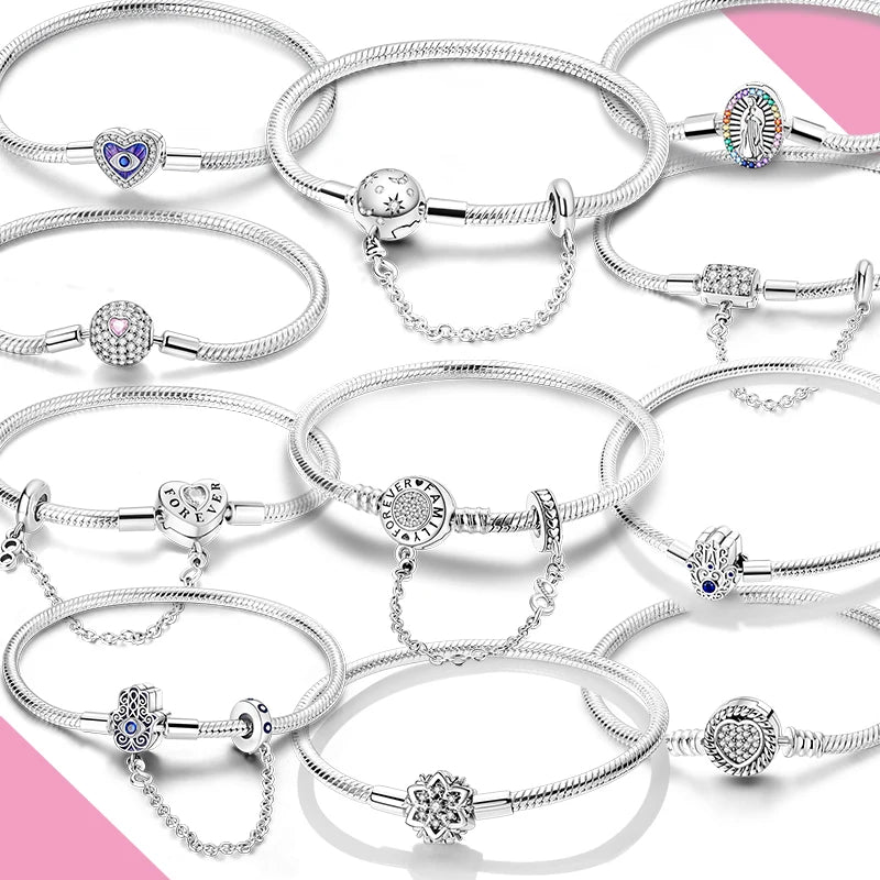 Craft your unique style with this 925 silver snake chain bracelet, designed to perfectly fit your favorite charms. Its secure clasp ensures comfortable, everyday wear, while the sleek, original design adds a touch of elegance to any outfit. Ideal for DIY jewelry lovers, this bracelet lets you express your personality with limitless charm combinations. Elevate your accessory game with this versatile and timeless piece made just for women.