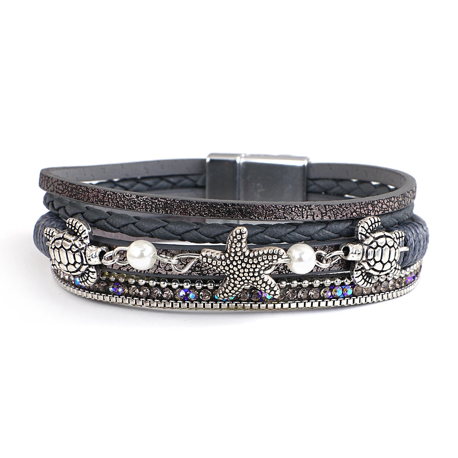 Embrace the spirit of summer with this Bohemian Pearl Beaded Leather Bracelet, featuring charming starfish and turtle accents complemented by sparkling crystals. Crafted with genuine leather and delicate beads, it adds a laid-back yet elegant touch to any outfit. Perfect for both women and men, this bracelet captures the essence of beachside fashion, making it an ideal