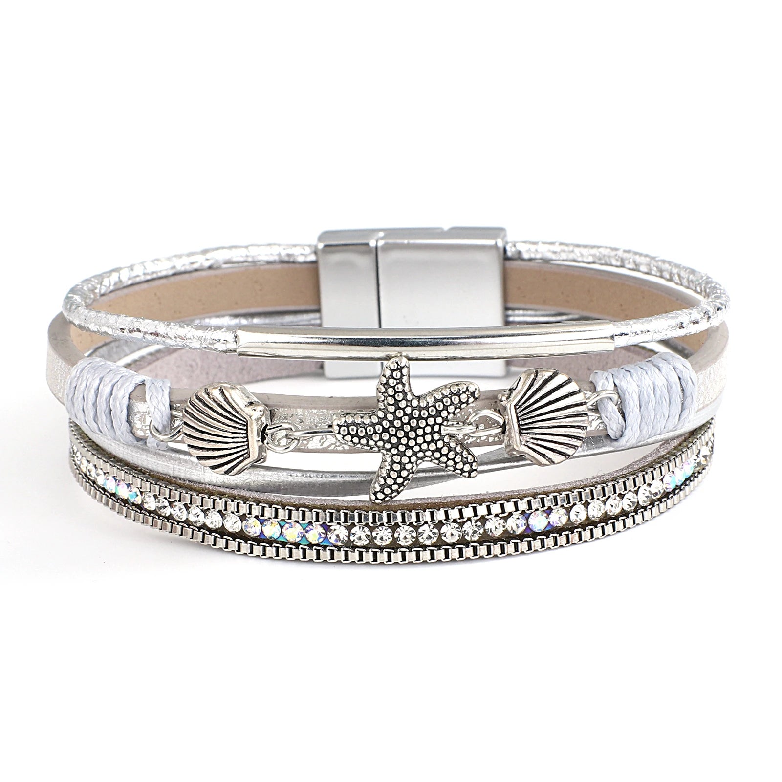 Embrace a touch of coastal charm with this Starfish Shell Leather Bracelet, designed for both women and men. Featuring boho-inspired metal tube accents and sparkling crystal beads, it adds a subtle pop of elegance to any outfit. The durable leather strap offers a comfortable fit, making it perfect for everyday wear or