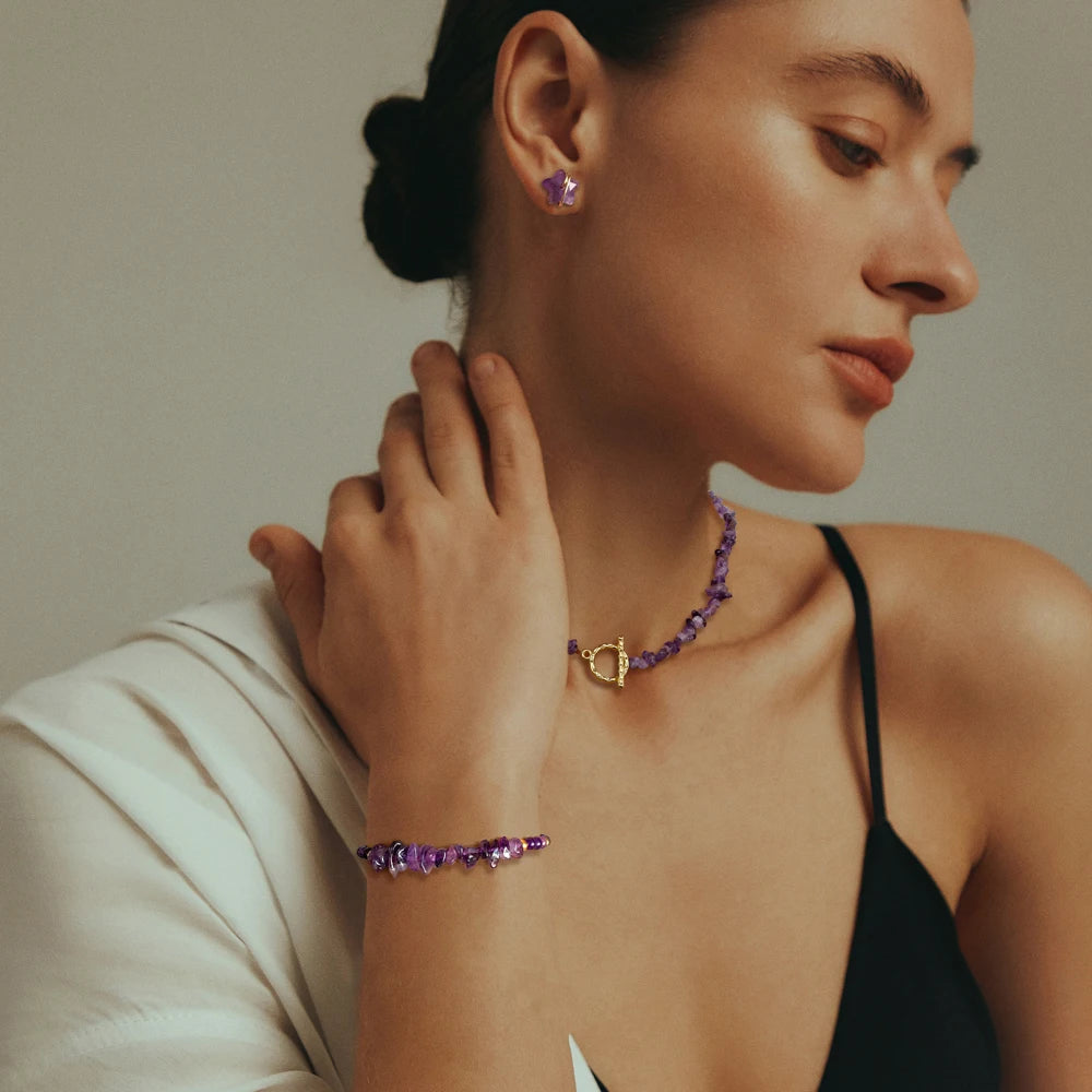 Embrace the natural energy of gemstones with this stunning three-piece jewelry set. Featuring genuine amethyst and green aventurine chip beads, this collection combines timeless elegance with holistic wellness. The set includes a flowing necklace, coordinating bracelet, and delicate star-shaped stud earrings—perfect for layering or wearing individually. Amethyst is traditionally associated with calm and clarity, while green aventurine promotes balance and prosperity. Whether you're drawn to their soothing properties or simply love their earthy beauty, these versatile pieces complement any style and make a meaningful gift for yourself or someone special.