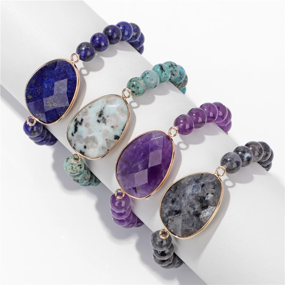 Experience the power of natural stones with these irregular charm bracelets, crafted from amethyst, lapis lazuli, labradorite, and white howlite. Perfect for both women and men, these beaded bracelets promote cleansing, balance, and good health. Beyond their striking appearance, they symbolize wealth, prosperity, and longevity, making them a meaningful accessory to support your well-being and style every day. Embrace the unique energy and timeless elegance these bracelets offer.