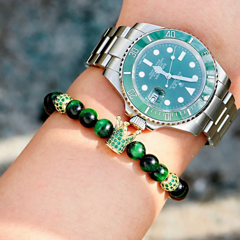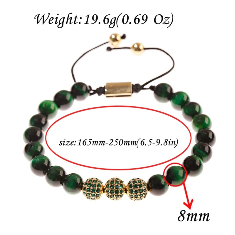 Indulge in luxury with our gorgeous bracelets, featuring blue and green zircon stones and a pink tiger eye bead. The crown ball design adds a touch of elegance to your look. Choose to wear it as a single or double bracelet for added versatility. Elevate your style with these classic pieces.
