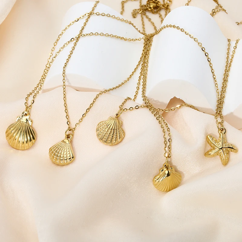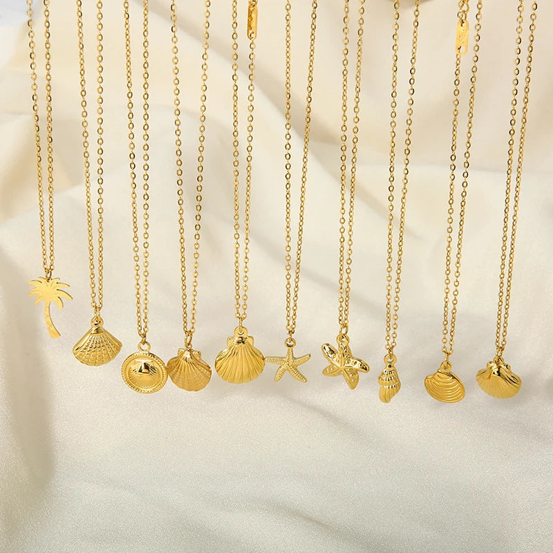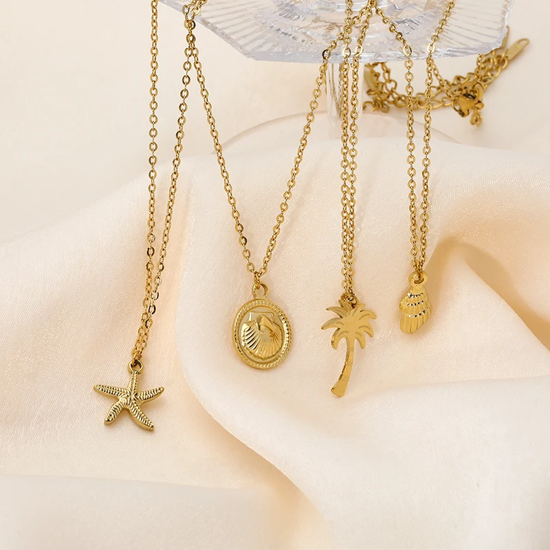 Embrace tropical elegance with these new 14k gold plated stainless steel necklaces, featuring unique pendants shaped like sea snail shells, starfish, coconuts, and palm trees. Designed for women who enjoy style and adventure, these waterproof pieces are perfect for holiday wear and everyday sophistication. Their durable construction ensures lasting shine, while the delicate design adds a graceful touch to any outfit. Capture the essence of island life and make a statement wherever you go with this charming collection.
