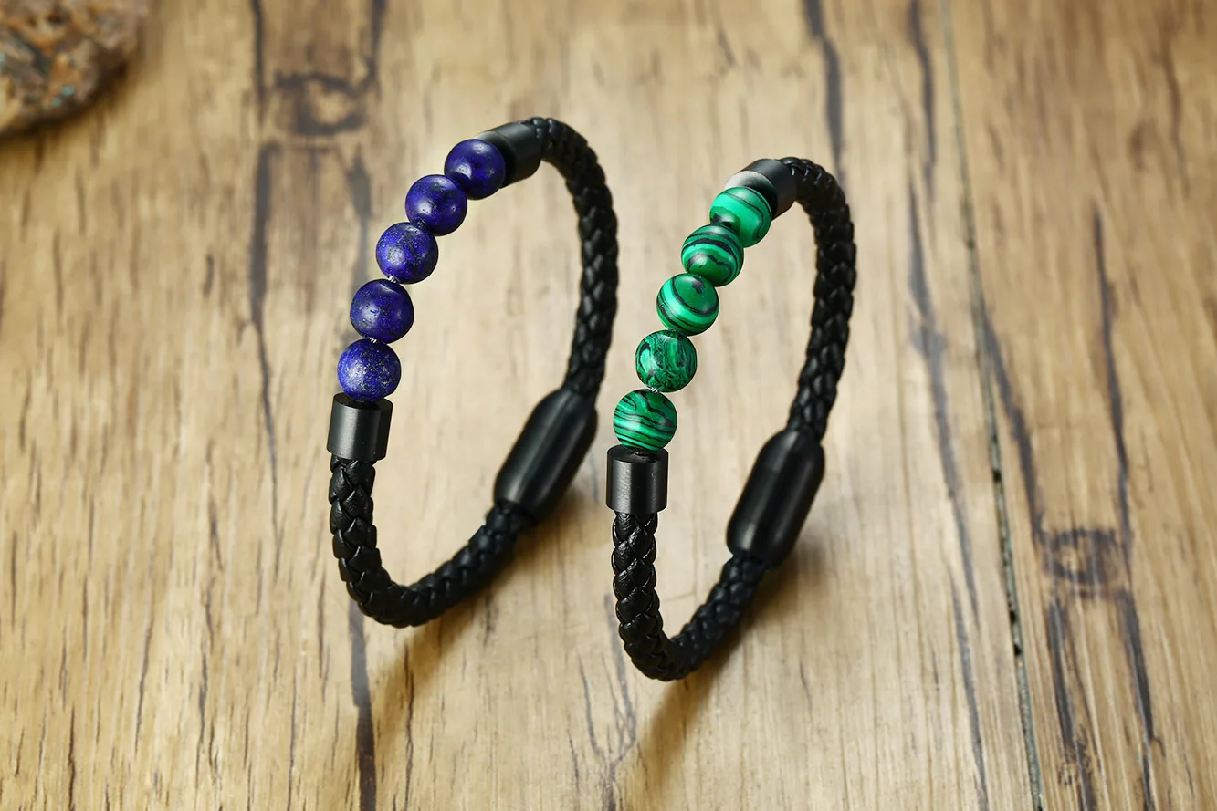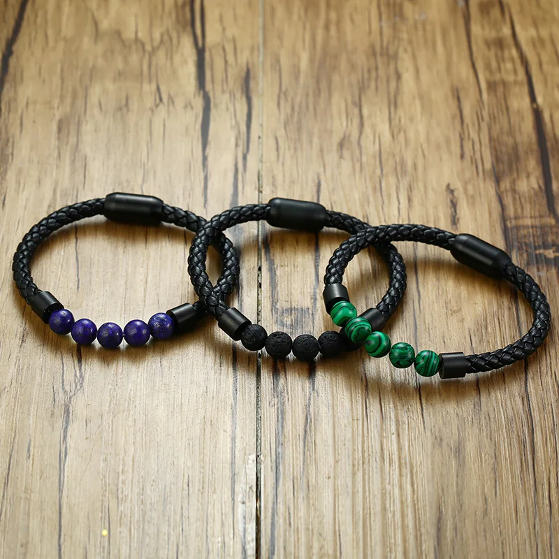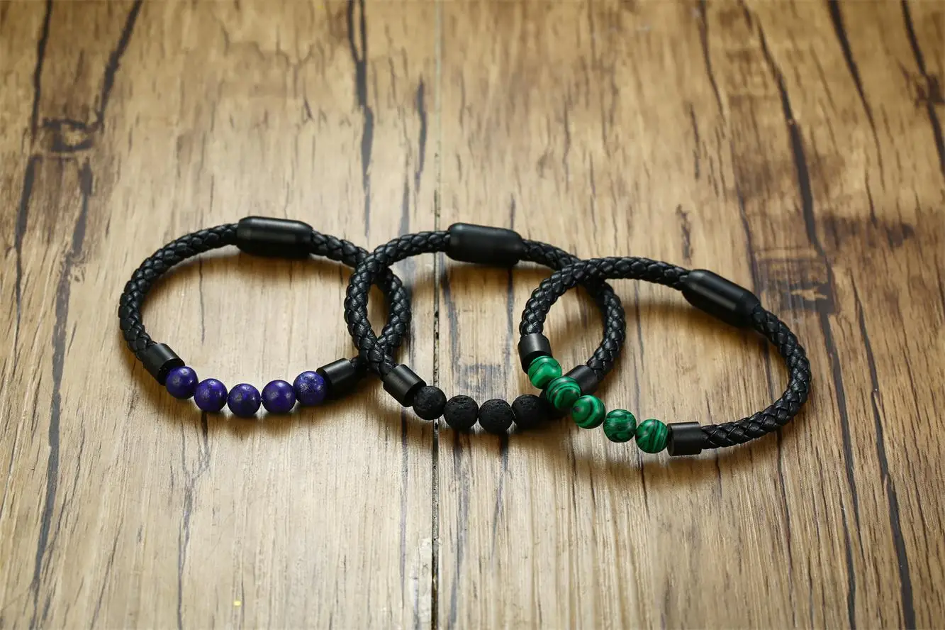 Black Volcanic Titanium Steel Beaded Leather Bracelets