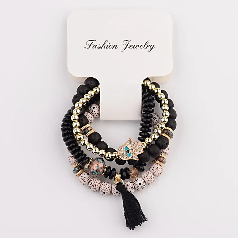 Add a touch of bohemian elegance to your look with this Beautiful Bohemia Women Bracelets Set. Featuring four handcrafted bracelets adorned with natural stone beads, charming tassels, and unique pendants, this set offers versatile styling options. Perfect for layering or wearing alone, these lightweight bracelets bring effortless sophistication and a free-spirited vibe to any outfit. Elevate your accessory game with this must-have collection.