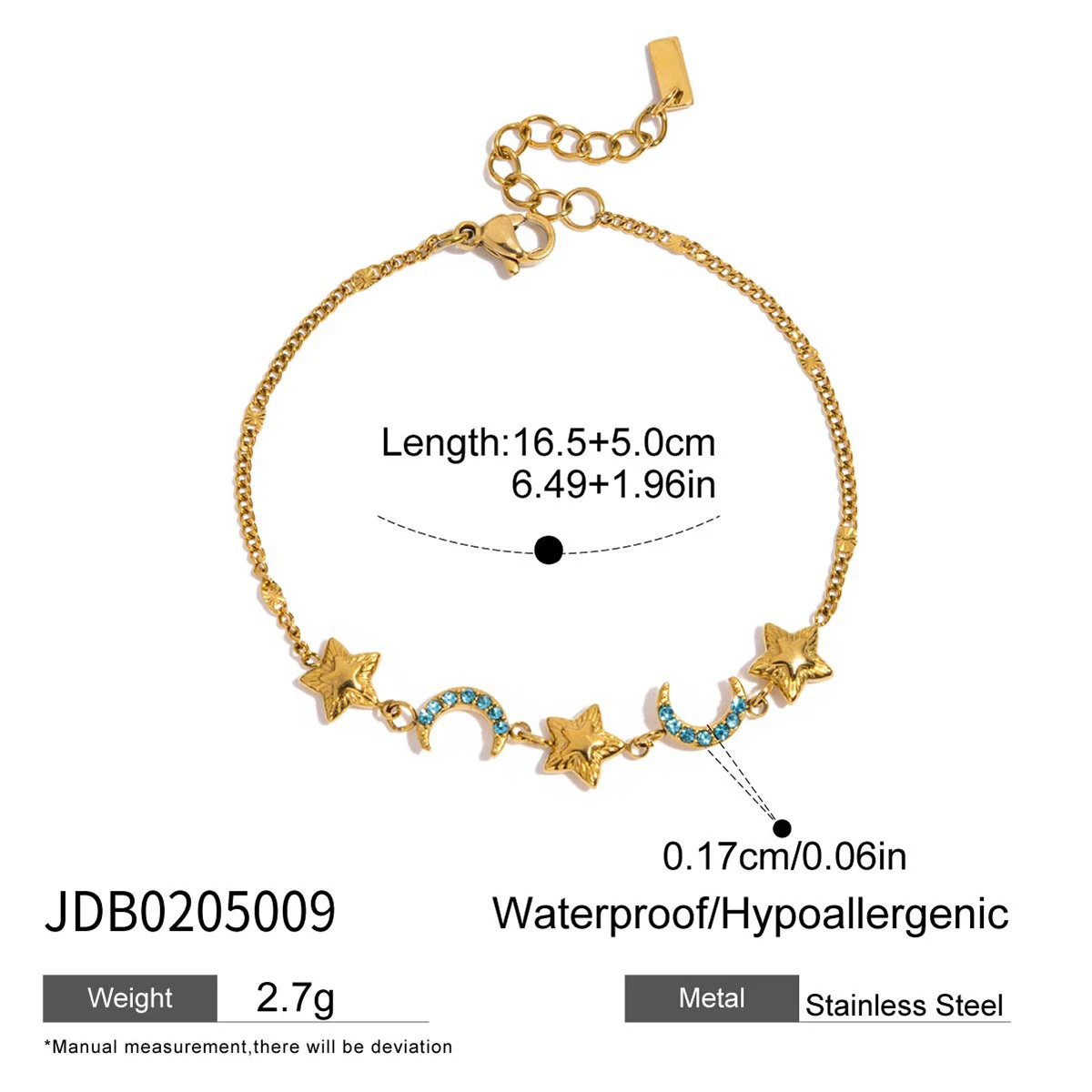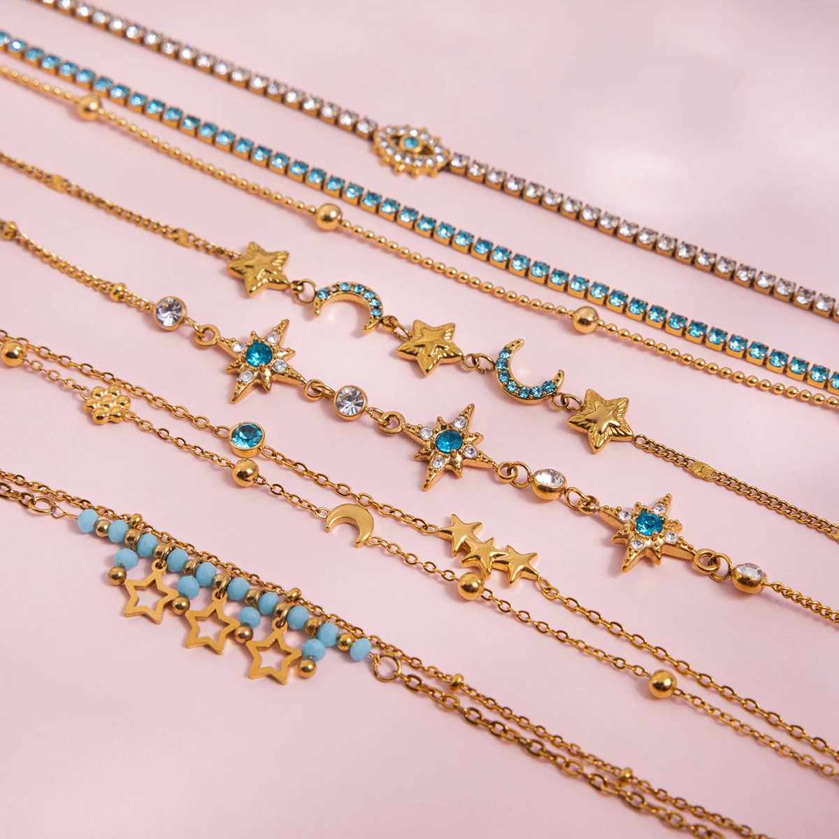 Escape into celestial elegance with this exquisite double bracelet, where dreamy star and moon motifs meet sparkling blue zircon brilliance. Engineered from durable stainless steel with luxurious 18K gold plating, this waterproof design travels with you—from beach getaways to everyday adventures. The dual-strand construction offers versatile styling options, whether stacked for impact or worn individually for understated sophistication. Designed for the modern woman who refuses to compromise between beauty and practicality, this piece radiates timeless charm while resisting water and wear. Transform any moment into a vacation state of mind.